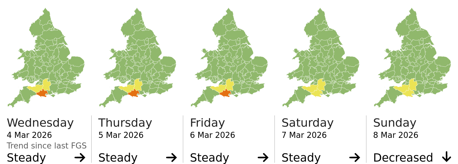 Ongoing groundwater flooding impacts are probable for parts of the South of England through the next five days, with ongoing river flooding impacts also probable across parts of Somerset. Properties could flood and there could be travel disruption.