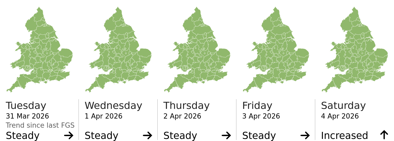 There are ongoing minor groundwater flooding impacts in the south of England. The level of ongoing disruption is being managed locally and awareness is high. Consequently, the groundwater flood risk in these areas is assessed as VERY LOW.